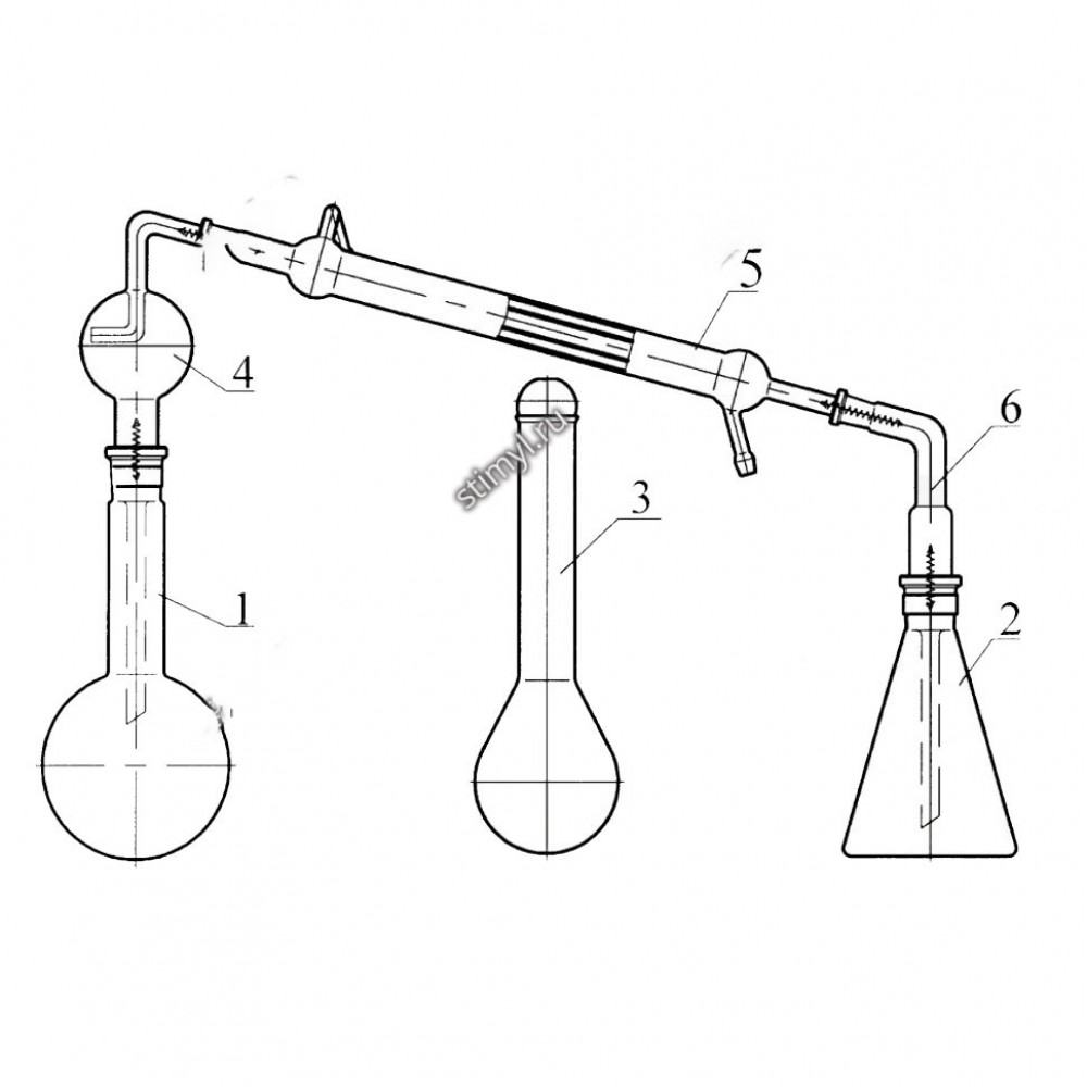 Аппарат Кьельдаля на шлифах предназначен для определения азота в органических веществах. Принцип действия аппарата Кьельдаля на шлифах основан на разложении органического вещества воздействием концентрированной серной кислоты. При этом азот переходит в аммиак, который взаимодействует с избытком серной кислоты и образует сульфат аммония. Сульфат аммония разлагают действием щелочи, а выделяющийся при этом аммиак титруют серной кислотой. По расходу серной кислоты при титровании вычисляется содержание азота во взятой навеске.