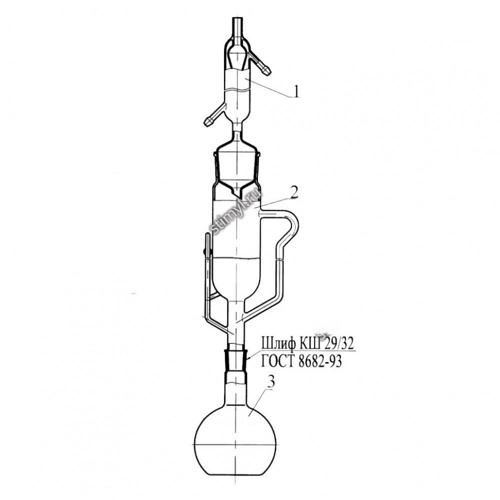 Как только уровень жидкости в гильзе достигает верхнего уровня сифона, гильза опустошается: раствор вещества сливается в исходную колбу и цикл повторяется снова. Таким образом, прибор позволяет производить многократную экстракцию за счёт повторного использования относительно небольшого объёма растворителя, при этом экстрагируемое вещество накапливается в основной колбе. Эффективность экстракции дополнительно увеличивается за счёт того, что гильза находится непосредственно над колбой и нагревается парами кипящего растворителя.Состоит из:
