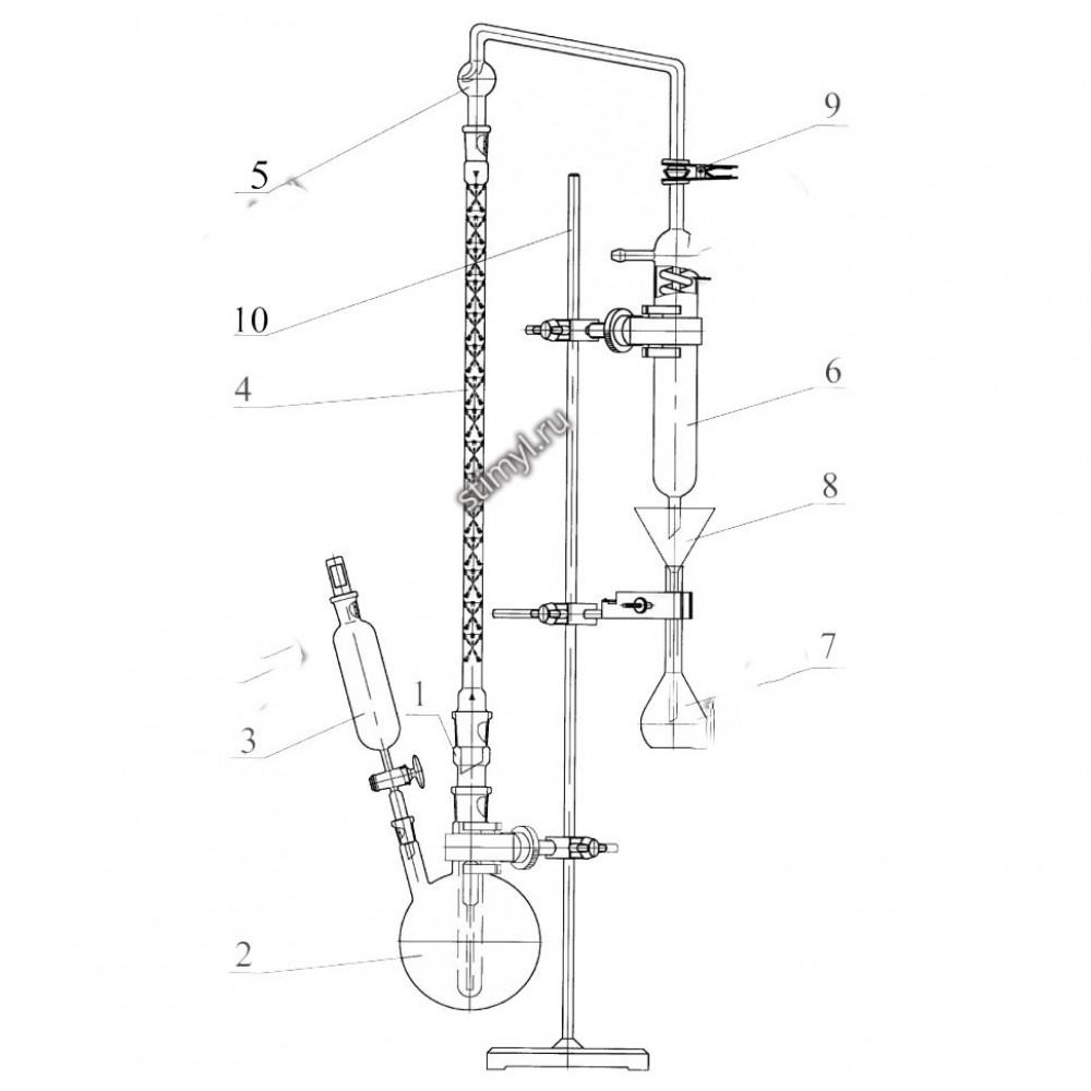 Прибор предназначен для отгонки бензойной кислоты из продуктов переработки плодов и овощей водяным паром для последующего определения содержания бензойной кислоты фотометрическим методом по ГОСТ 28467-90. Состоит из: